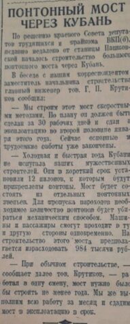 В заметке «Понтонный мост через Кубань» рассказывается, как «недалеко от станицы Пашковской началось строительство большого понтонного моста через Кубань». Удивляют заявленные сроки возведения сооружения.