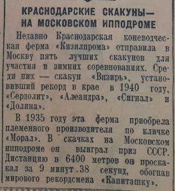 Гордость Краснодара тех времен — коневодство. Наши скакуны «трудились» по-стахановски и брали призы на лучших скачках мира.