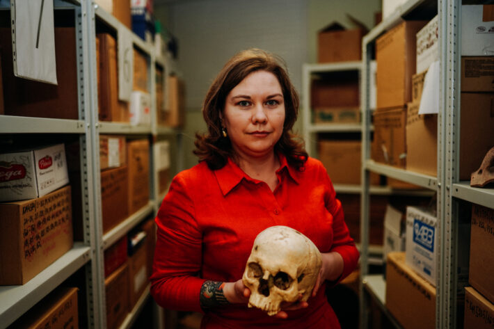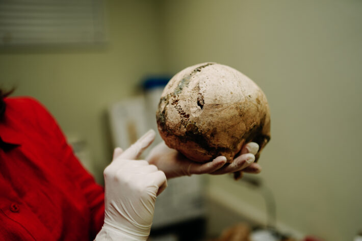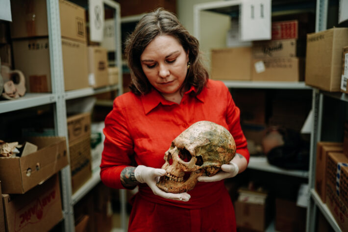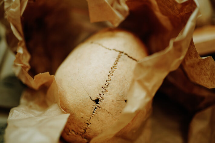 Антрополог достает из коробки сверток, аккуратно снимает крафтовую бумагу и показывает нам один из черепов. На нас смотрят пустые глазницы, на месте носа — дыра: носовые кости сгнили во время неправильного хранения в полиэтиленовых пакетах.