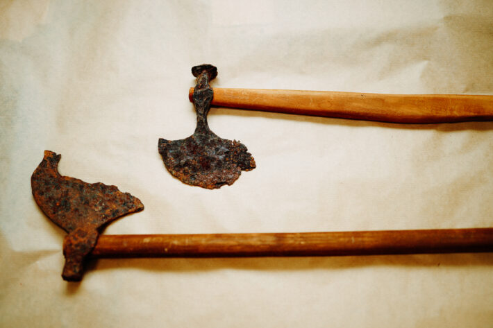 Затем Абрамова берет череп ребенка. Он, скорее всего, умер от того, что ему проломили череп — удар пришелся сверху слева. А потом, уже посмертно, отрубили голову. Есть черепа с отрубленными сосцевидными отростками — то есть людям срезали уши, скорее всего, в бою, но, возможно, и в качестве сувенира. А есть черепа со следами воспалительного процесса, и это говорит о том, что всех раненых мужчин, видимо, пленили и несколько дней где-то продержали, после чего уже обезглавили.