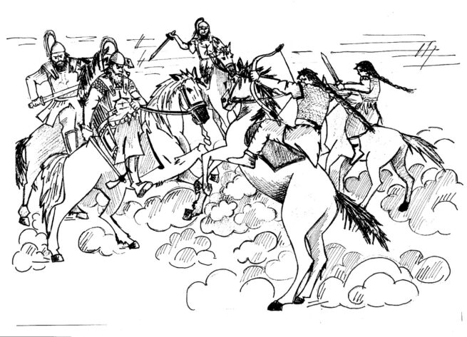 Р. Схатум: — Может, и так. Но это для нас сейчас мальчик девяти или пятнадцати лет — ребенок. А в то время это были уже воины, которые владели кинжалом, луком и стрелами. Также они могли быть оруженосцами.
