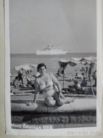 Работа нравилась: она приносила деньги и позволяла отдохнуть на лучших пляжах черноморского побережья Советского Союза. На фото — в Пицунде на фоне «Адмирала Нахимова».