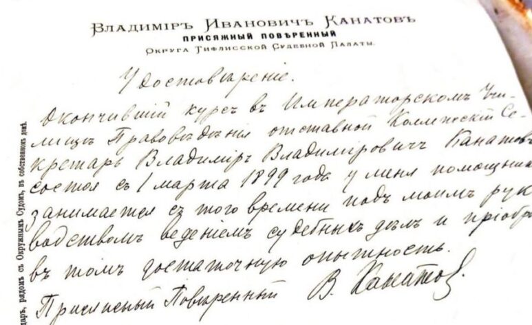 «Окончивший курс в Императорском Училище Правоведения отставной Коллежский Секретарь Владимир Владимирович Канатов, состоя с 1 марта 1899 года у меня помощником, занимается из того времени под моим руководством ведением судебных дел и приобрел в том достаточную опытность.
