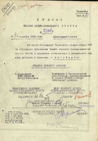 Так писал в представлении на награду командир 11-го стрелкового корпуса 9-й армии Северо-Кавказского фронта генерал-майор Рубанюк. Представление поддержал командарм генерал-майор Коротеев. Приказом войскам фронта от 10 марта 1943 года полковник Метальников был награжден своей первой боевой наградой — орденом Красного Знамени.