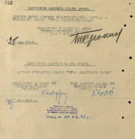 25 мая ходатайство поддержал командующий 8-й Воздушной армией генерал-лейтенант авиации Хрюкин и командующий войсками фронта генерал-полковник Толбухин.
