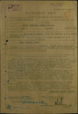 Наградной лист Лучинского с подписью маршала Рокоссовского