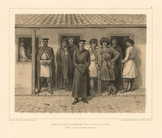 Литография. Казаки и солдаты — защитники укреплений на кордонной линии на Кубани.
