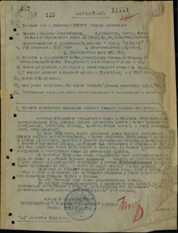 «Противник численностью 1500 солдат при поддержке 7 танков 4 раза переходил в контратаки, чтобы прорваться на Запад, но благодаря личной храбрости тов. Шкунов сумел организовать бой, все атаки были отбиты, противник понес потери в живой силе до 300 солдат».