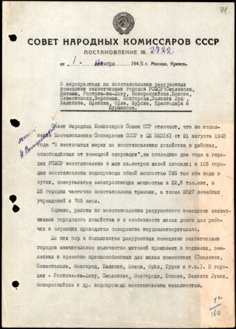 По заключению госкомиссии 1 ноября 1945 г. председатель Совета народных комиссаров СССР генералиссимус Иосиф Сталин подписал постановление СНК СССР «О мероприятиях по восстановлению разрушенных немецкими захватчиками городов РСФСР: Смоленска, Вязьмы, Ростова-на-Дону, Новороссийска, Пскова, Севастополя, Воронежа, Новгорода, Великих Лук, Калинина, Брянска, Орла, Курска, Краснодара и Мурманска».