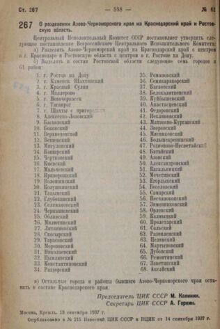 К 1941 году наш край включал 6 городов краевого подчинения: Краснодар, Армавир, Ейск, Новороссийск, Сочи, Туапсе и 5 городов районного: Анапу, Геленджик, Кропоткин, Темрюк, Тихорецк, 7 рабочих и 5 курортных поселков, 72 сельских района. Краснодар стал крупным административным, промышленным и культурным центром на юге России. Его население на 1 января 1940 г. насчитывало 191 803 человека.