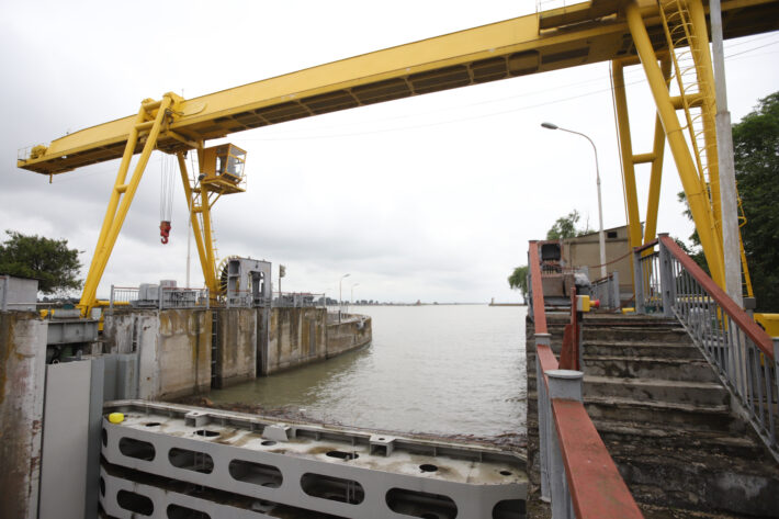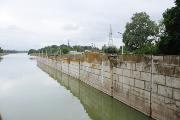 Подъезжаем на КПП перед мостом через шлюз, где нас уже ждут. Охранник открывает ворота, и мы еще несколько минут спускаемся по дороге, петляющей в гуще деревьев. Наконец они расступаются, въезжаем на открытую площадку у водосброса. Шум воды слышен за сотни метров. Не знай мы, что здесь находится, подумали бы водопад. Да, пожалуй, так и можно описать систему водосброса: высокое металлическое сооружение, с которого отвесно падает вода. Внизу она бурлит пару десятков метров, а потом чуть успокаивается и уносится течением. Оно здесь, к слову, очень сильное. И хотя вдоль левого берега Кубани, одетого, как и правый, в бетонные плиты, стоят жилые дома, желающих искупаться нет.
