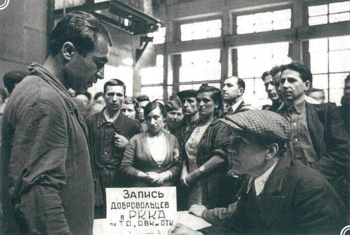Люди записывались на фронт добровольцами прямо на своем рабочем месте.